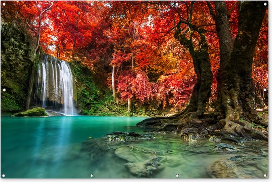 Muurdecoratie Waterval - boom - Rood - Herfst - Water - 180x120 cm - Tuinposter - Tuindoek - Buitenposter