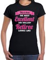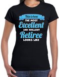 Laat het afscheid van de leukste collega extra bijzonder zijn met dit fantastische cadeau- of verkleed T-shirt voor dames! Het zwart-blauwe T-shirt met de tekst "This is how the most Excellent and brilliant Retiree looks like" is de perfecte manier om te laten zien hoeveel je die collega waardeert. Of je het cadeau geeft of zelf draagt tijdens het afscheid, dit T-shirt zorgt gegarandeerd voor een glimlach en een vrolijke sfeer. Met de opvallende boodschap en vrolijke kleuren maak je van het afscheid een feestje dat de collega niet snel zal vergeten. Tijd om in stijl de pensioenroute te volgen! "Want met dit T-shirt vergeet je nooit wie de leukste collega was, zelfs na de laatste werkdag!". Materiaal: 145 grams, 100% katoen. Merk: Bellatio Decorations.