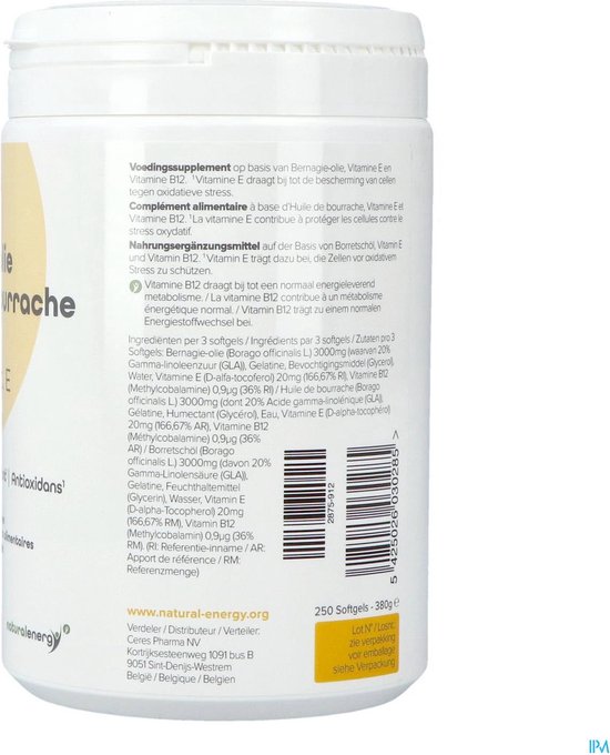 Bernagie Olie | 250 Softgels met Borage Olie – Vitamine E – Komkommerkruid