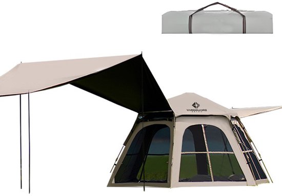 Pop-up Familietent met XXL Zonnescherm - 4-Persoons Koepeltent - Opzetten in 3 Seconden - Inclusief Voorluifel voor Extra Leefruimte - Waterdichte kampeertent - pop up tent voor Kamperen - festival tent + Draagtas - Kaki