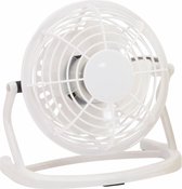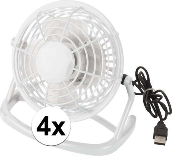 4x mini ventilator met USB aansluiting. Kunststof bureau ventilator inclusief USB kabel (ca. 93 cm) in de kleur wit. Op de achterzijde bevindt zich een aan en uit knop. Geeft u verkoeling wanneer u dat nodig heeft aan uw bureau. Formaat: ongeveer 14,5 x 14,8 x 9,4 cm.