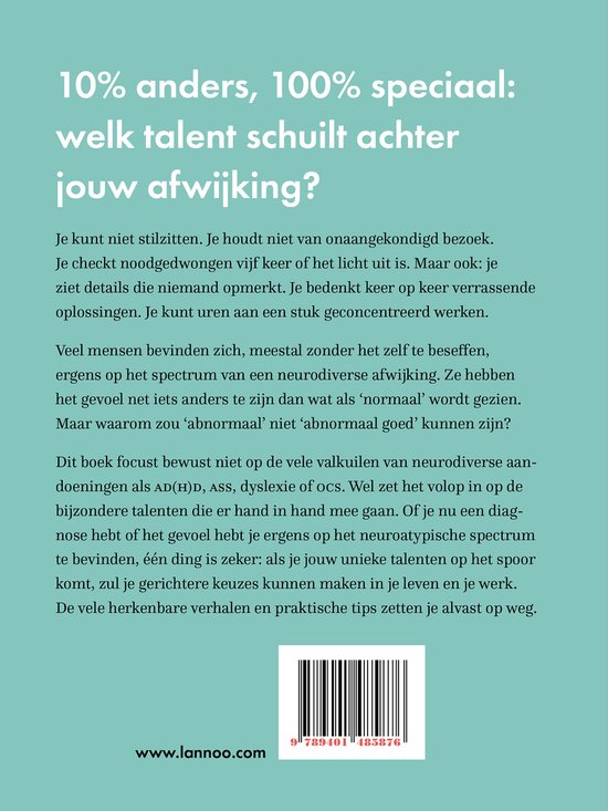 Dit boek focust bewust niet op de vele valkuilen van neurodiverse aandoeningen als AD(H)D, ASS, dyslexie of OCS. Wel zet het volop in op de bijzondere talenten die er hand in hand mee gaan. Of je nu een diagnose hebt of het gevoel hebt je ergens op het neuroatypische spectrum te bevinden, één ding is zeker: als je jouw unieke talenten op het spoor komt, zul je gerichtere keuzes kunnen maken in je leven en je werk.