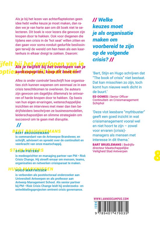Alles is onder controle! beschrijft hoe organisaties zich kunnen wapenen om eenmaal ze in een crisis terechtkomen te overleven. De auteurs zijn gewoon om dagelijks dilemma's te ontwarren of harde knopen door te hakken. Op basis van hun eigen ervaringen, wetenschappelijke inzichten en interviews met meer dan tien bedrijfsleiders beschrijven ze businessmodellen, leiderschapsstijlen en slimme strategieën om succesvol om te gaan met disruptie.