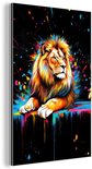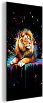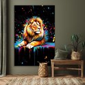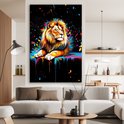 Een majestueuze leeuw met een bontgekleurde manen rust op een donkere ondergrond, omgeven door spetters van blauwe, rode en gele verf. Zijn intense blik straalt kracht en trots uit...