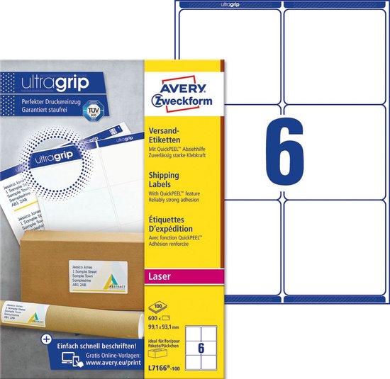 De permanente AVERY® Zweckform verzendetiketten bestaan uit een bijzonder ondoorzichtig materiaal dat oude inscripties en etiketten betrouwbaar bedekt. Dankzij de innovatieve QuickPEEL™-trekhulp kunnen ze snel worden verwerkt in magazijnen en kantoren. De unieke Ultragrip-technologie aan de achterzijde van het vel garandeert een precieze invoer van het drukwerk en een storingsvrije bedrukking.