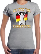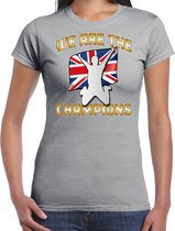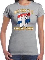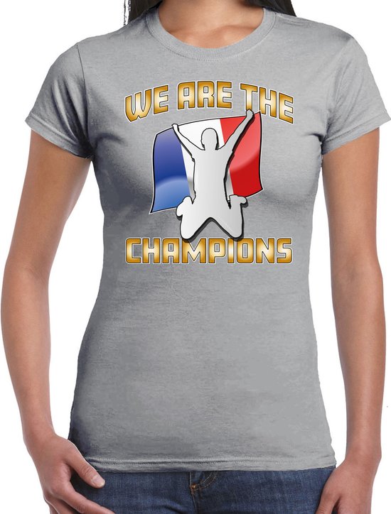 Verkleed T-shirt voor dames in de kleur grijs. Het shirt is bedrukt met de tekst: We are the champions! Met de vlag van Frankrijk. Heb je binnenkort een voetbal wedstrijd of een ander sport evenement waarbij je Frankrijk wil aanmoedigen? Dan is dit bedrukte T-shirt de perfecte keuze! Support Frankrijk met dit leuke bedrukte shirt. Ook leuk om te dragen naar een themafeestje of gewoon zomaar. Materiaal: 145 grams, 100% katoen. Merk: Bellatio Decorations.
