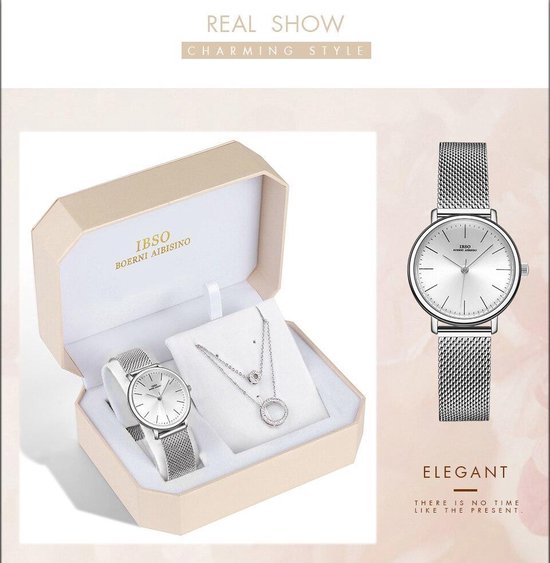 Boerni Aibisino Horloge en Ketting Zilver kleur luxe geschenk set | Crystal glass | Premium kwaliteit uurwerk Quartz Japan | Mineraal | Geschenk | Fashion | Elegant | Dames | Vrouw | Black Friday