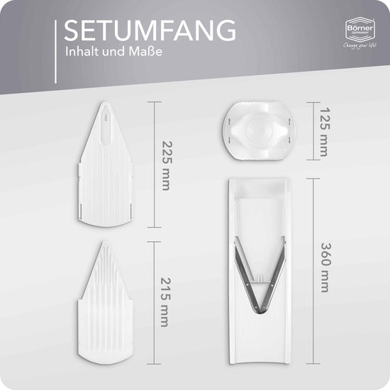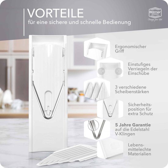 Een vriendin was al jaren enthousiast over de Börner mandoline. Mijn exemplaar werd snel geleverd. Ik vind het ook een erg handig apparaat en voor wie even moet wennen is er een instructiefilmpje op Youtube te vinden. Ik bestelde een basisset en over de bijgeleverde accessoires was even verwarring, maar die werd heel snel opgehelderd (prettige, persoonlijke service) en het klopt allemaal. Voortaan mooie plakjes courgette en extra dunne schijfjes ui zonder gedoe en tranende ogen. Wie extra opties zoekt zoals frites of julienne snijden, kan een uitgebreidere set bestellen.