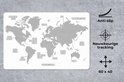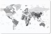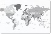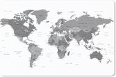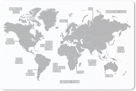 Over de fotoprintEen wereldkaart met een lichte grijze tint, de landen bevatten witte omlijningen. Zeeën, oceanen en continenten worden aangegeven met een naambordje..