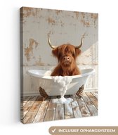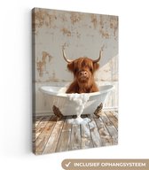 Canvas schilderij 80x120 cm - Wanddecoratie badkamer Schotse hooglander - Bad - Schuim - Koe - Muurdecoratie WC - Decoratieve accessoires - Toilet muur decoratie - Schilderijen op canvas