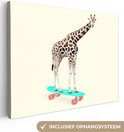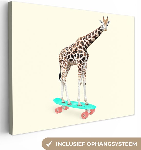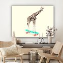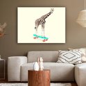 Ben jij op zoek naar nieuwe style voor jouw interieur? Dan is deze muurdecoratie perfect voor jou! Op het doek zie je een grappig beeld van een giraffe op een skateboard.