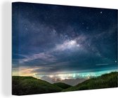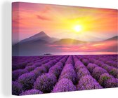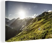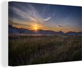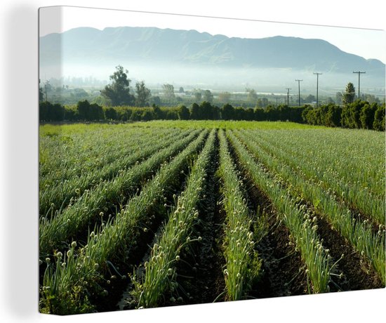 Canvas schilderij 150x100 cm - Wanddecoratie Uien in het veld met uitzicht op de bergen - Muurdecoratie woonkamer - Slaapkamer decoratie - Kamer accessoires - Schilderijen