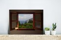In een donkere kamer staat het raam wijd open. Het raam biedt een uitzicht op de dicht begroeide kustlijn van Griekenland.