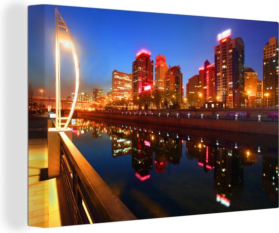 Canvas Schilderij Weerspiegeling van een skyline in een gracht - 30x20 cm - Wanddecoratie