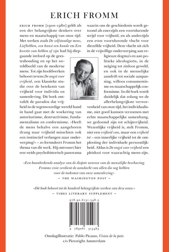 Dit boek is een klassieker. Het is een sterk onderbouwde studie naar de frictie tussen de aangeboren drang van de mens naar vrijheid en tegelijkertijd het instinctief verlangen naar onderwerping. De moderne maatschappij (onze democratie) gaf onafhankelijkheid en redelijkheid, maar ook angst en machteloosheid. De angst voor eenzaamheid en een gevoel van een te grote verantwoordelijkheid hebben wegens het toenemende individualisme kan de neiging bevorderen van het vastklampen aan totalitaire hiërarchie. Volkomen actueel dus.