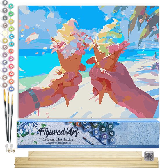 Figured'Art Schilderen op Nummer Volwassenen canvas IJsje op het strand- Handwerk acrylverf Kit DIY Compleet - 40x50cm met DIY houten lijst