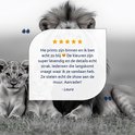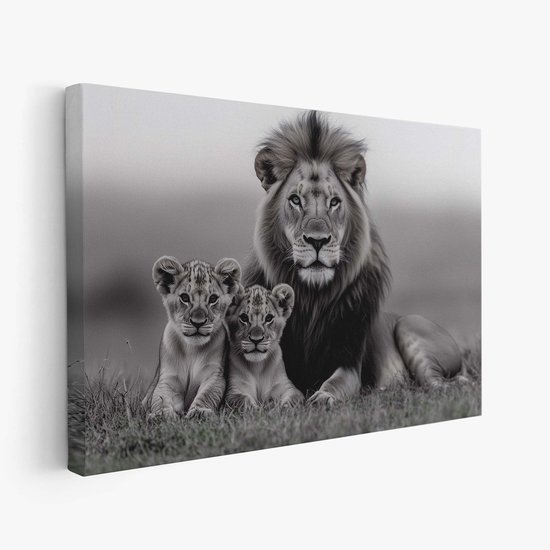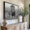 Zacht licht omhult de trotse leeuw en zijn spelende welpen, gevangen in tijdloze zwartwitmagie. Zijn blik waakt, terwijl de kleintjes tegen hem aan kruipen – een tafereel van tederheid en kracht. De harmonieuze compositie brengt rust en karakter, perfect voor een moderne woonruimte waar natuur en elegantie samenkomen. Een moment van pure wildernis, stilgezet voor altijd.