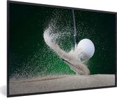 Lijst - Poster - Een mannelijke golfer slaat de golfbal uit de bunker op het green - Fotolijst
