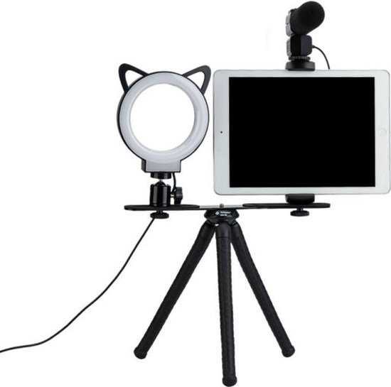 De Fotopro L1 is de ideale selfie lamp met statief om te vloggen voor binnen en buiten. De lamp is voorzien van verstelbare selfielamp met leuke katten oren. De lamp is gemakkelijk in sterkte te verstellen doormiddel van de adapter. Verder wordt een een dubbel statief meegelverd waardoor je zowel de lamp als bijvoorbeeld je mobiel kunt bevestigen. Door het flexibele statief kan het gemakkelijk in de hand gehouden worden of ergens aan bevestigd.