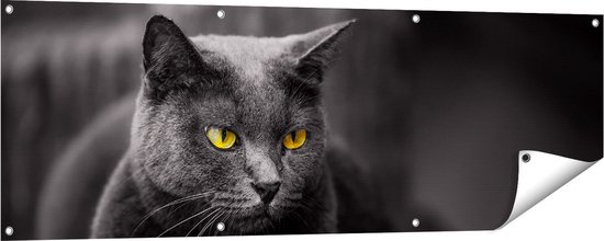Gards Tuinposter Zwarte Kat met Gele Ogen - 150x50 cm - Tuindoek - Tuindecoratie - Wanddecoratie buiten - Tuinschilderij