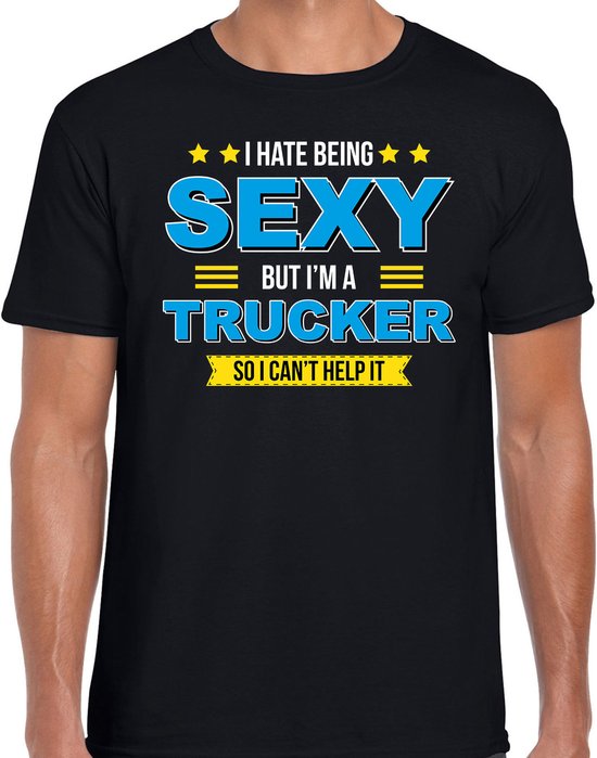 Hate being sexy but Im a trucker / Haat sexy zijn maar ben vrachtwagenchauffeur cadeau t-shirt zwart voor heren. Op dit zwarte shirt staat in blauw / witte letters de tekst: I hate being sexy but Im a trucker so I cant help it.