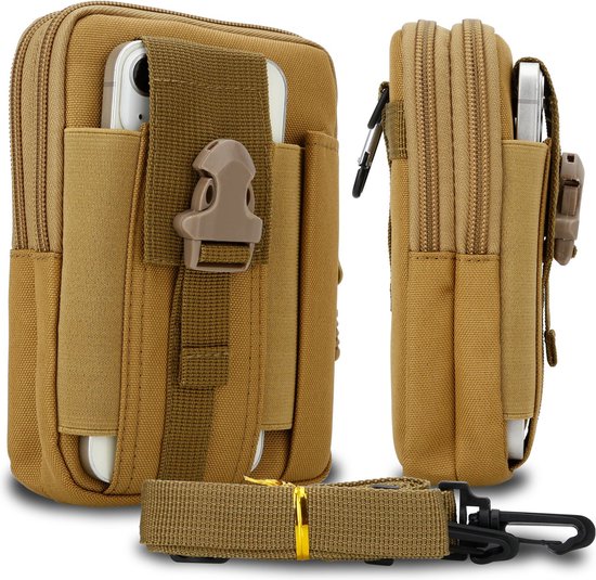 Het tasje kan flexibel worden bevestigd. De tas kan horizontaal of verticaal worden bevestigd aan een riem, rugzak, schoudertas of gilet met behulp van een Molle-riem. Inclusief schouderriem.