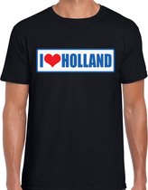 Holland landen t-shirt oranje voor heren. Op dit oranje shirt staat een bordje met de tekst: HOLLAND. Het bordje heeft de kleuren van de Nederlandse vlag!