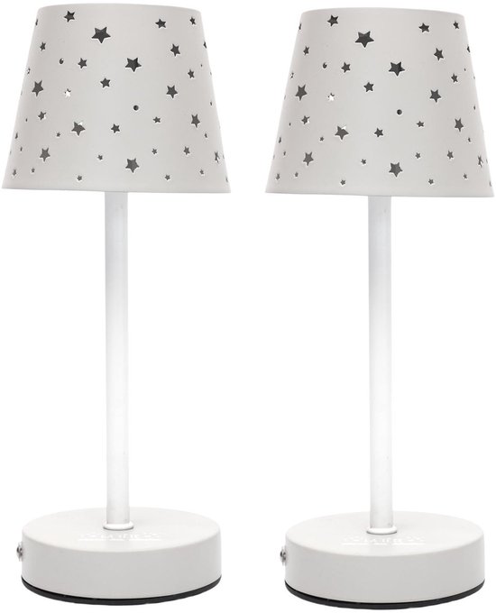 2x home deco factory oplaadbare kinderkamer tafelamp. Creëer een warme sfeer in iedere kinderkamer met deze stijlvolle oplaadbare tafellamp in een lichtgrijze uitvoering. De lamp heeft een hoogte van 28,5 cm en is voorzien van een sterrenmotief, dat zorgt voor een subtiel lichtspel zodra de lamp wordt ingeschakeld.