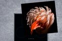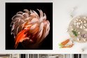Macro weergave van een flamingo op een zwarte achtergrond. De veren worden verlicht..Productspecificaties