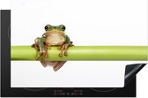 Een weergave van een roodoogmakikker dar zicht stevig vasthoudt aan een stuk bamboe. De achtergrond van de weergave is wazig. Deze afbeelding komt goed tot zijn recht in de woonkamer..Productspecificaties