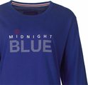 - Kobaltblauwe top met witte en rode tekstprint "MIDNIGHT BLUE"