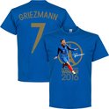 Cool Retake t-shirt in het blauw als ode aan Antoine Griezmann. Dit t-shirt bevat een print van de speler in het Frankrijk shirt met op de achtergrond een speciaal Eiffeltoren logo in het goud. Dit betreft een t-shirt ter ere van de Euro 2016 topscorer titel van de Fransman. De Franse sterspeler werd met zes doelpunten tijdens het EK in eigen land topscorer. De achterkant van dit te gekke Retake t-shirt bevat de naam en het nummer van de sterspeler: Griezmann (7). Bovendien bevat de achterkant een verwijzing naar de topscorertitel. Ideaal voor de echte fan! 100% katoen.