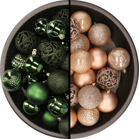 Set van 74x stuks onbreekbare kerstballen in een mix van donkergroen en lichtbruin. Wij adviseren u om kerstbalhaakjes mee te bestellen (niet inbegrepen).