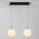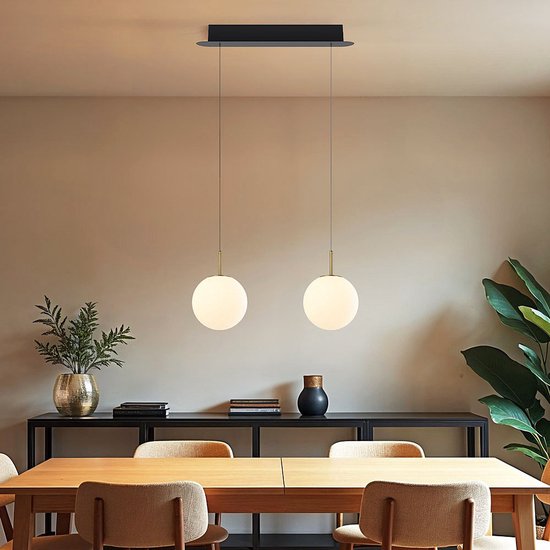 Technische aspectenSvea heeft een zwarte langwerpige plafondplaat van 59 x 6 cm, waardoor de twee kabels van 190 cm gemakkelijk kan worden ingekort. De glazen bollen hebben een diameter van 20 cm. De geïntegreerde LEDs heeft een kleurtemperatuur van 2700K (warm wit) met 3-staps dimbare functie. Met de dimbare LEDs kun je zelf kiezen tussen een lichtopbrengst van 216, 659 of 1471 lumen.