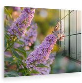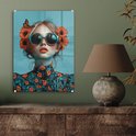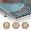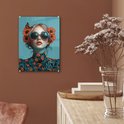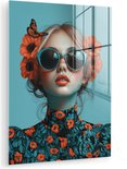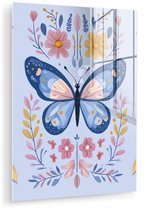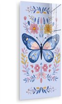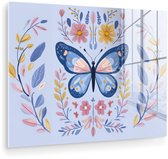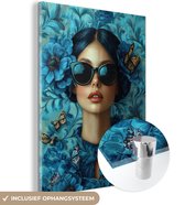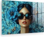 Glasschilderij - Vrouw - Blauw - Vlinder - Bloemen - Aesthetic - Woonkamer - Slaapkamer