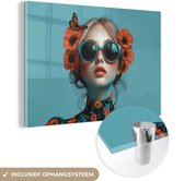 MuchoWow® Glasschilderij 30x40 cm - Schilderij acrylglas - Vrouw - Blauw - Vlinder - Bloemen - Aesthetic - Foto op glas - Muurdecoratie woonkamer - Wanddecoratie slaapkamer - Schilderijen