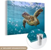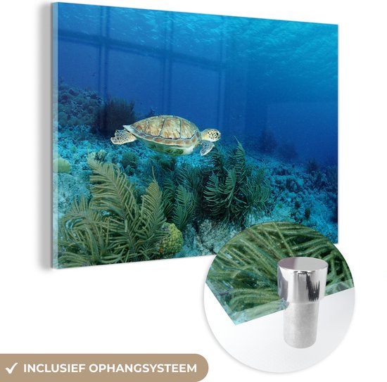 MuchoWow® Glasschilderij 30x20 cm - Schilderij acrylglas - Groene zeeschildpad op Bonaire - Foto op glas - Schilderijen