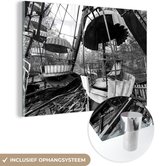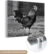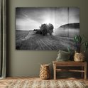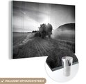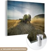 MuchoWow® Glasschilderij 180x120 cm - Schilderij acrylglas - Landbouwmachine op een maïsveld - zwart wit - Foto op glas - Schilderijen