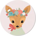 Over de fotoprintEen hert met grote ogen en een krans van zomerbloemen op haar hoofd..