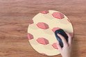 Over de fotoprintWeergave van een patroon met zomerse parasols met rood witte strepen. De achtergrond heeft een pastel roze kleur..