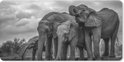 In Ethiopië staat deze familie van olifanten aan het water. Hun lange slurven gebruiken ze om het water op te drinken. De groep dieren staat op deze afbeelding weergegeven in zwart-witte kleuren..