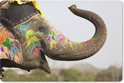 De huid van deze olifant in India is omgetoverd tot een waar kunstwerk. Het dier houdt enthousiast zijn slurf omhoog..