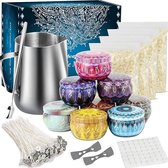 Wat er wordt meegeleverd als je dit product bestelt. - 4x 120gram bijenwas 8x blikjes (60gr was per blikje) 4x oliën (vanille, lavendel, roos en citroen) 8x kleurstofblokjes (om de geurkaars kleur te geven) 50x lonten van katoen (genoeg!) 56x plakkertjes 2x lontenhouders (je kan dus 2 kaarsen per keer maken) 1x lepeltje om mee te roeren 1x kannetje om was in te smelten en in te mixen