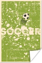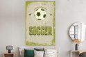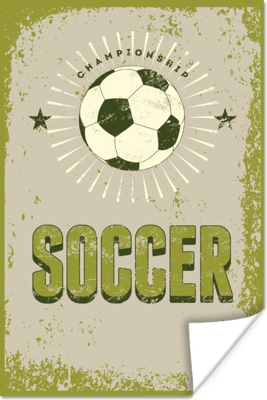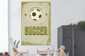 Een prachtige illustratie van een voetbal die door de vele krassen en vlekken een vintage uitstraling heeft. De zwart met witte bal wordt omringd door lijnen en twee zwarte sterren. Onder de bal is met groene letters de quote "Soccer" geschreven. Deze weergave komt goed tot zijn recht in de woonkamer of de kinderkamer.