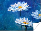 Olieverf schilderij van madeliefjes op een blauwe achtergrond.