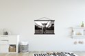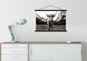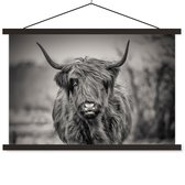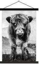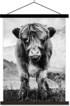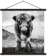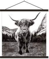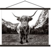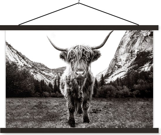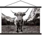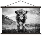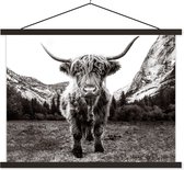 Posterhanger incl. Poster 90x60 cm - Schoolplaat - Berg - Zwart - Wit - Schotse Hooglander - Textielposter - Zwarte latten
