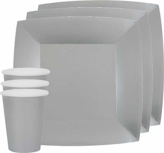 Santex feest/verjaardag servies set bestaande uit 20x feest bordjes vierkant en 20x bekertjes in de kleur zilver. Wegwerp party bordjes en bekers van stevig karton, om ieder feestje mee compleet te maken.