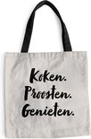 MuchoWow® Schoudertas - Strandtas - Big Shopper - Boodschappentas - Koken. proosten. genieten. - Quote - Taupe - 45x45 cm - Katoenen tas