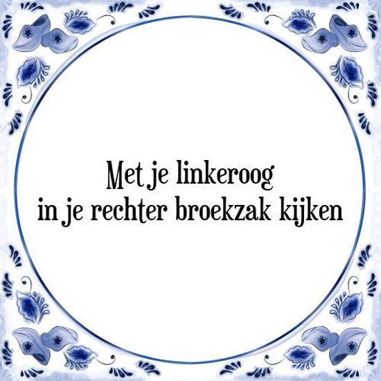 Een Origineel kado? Met dit echte Keramische tegeltje met spreuk (15,2 x 15,2 cm) word je herinnerd! Deze originele tegel is voorzien van de tekst: 'Met je linkeroog in je rechter broekzak kijken' en wordt speciaal voor jou ingebakken op 200 graden celcius.