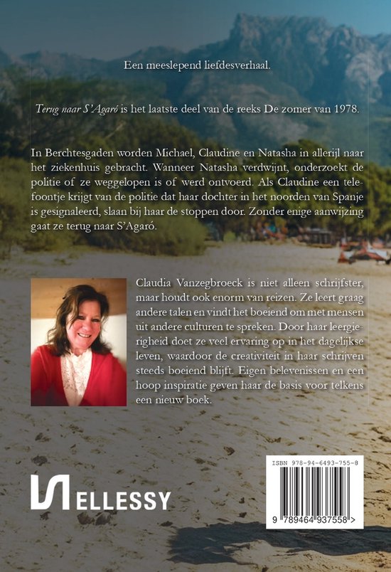 Een meeslepend liefdesverhaal. Terug naar S'Agaró is het laatste deel van de reeks De zomer van 1978. In Berchtesgaden worden Michael, Claudine en Natasha in allerijl naar het ziekenhuis gebracht. Wanneer Natasha verdwijnt, onderzoekt de politie of ze weggelopen is of werd ontvoerd. Als Claudine een telefoontje krijgt van de politie dat haar dochter in het noorden van Spanje is gesignaleerd, slaan bij haar de stoppen door. Zonder enige aanwijzing gaat ze terug naar S'Agaró. Claudia Vanzegbroeck is niet alleen schrijfster, maar houdt ook enorm van reizen. Ze leert graag andere talen en vindt het boeiend om met mensen uit andere culturen te spreken. Door haar leergierigheid doet ze veel ervaring op in het dagelijkse leven, waardoor de creativiteit in haar schrijven steeds boeiend blijft. Eigen belevenissen en een hoop inspiratie geven haar de basis voor telkens een nieuw boek.